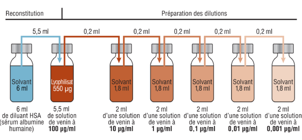 Chaque flacon contient 100 µg/ml de venin après reconstitution de la solution avec 5,5 ml de solvant.